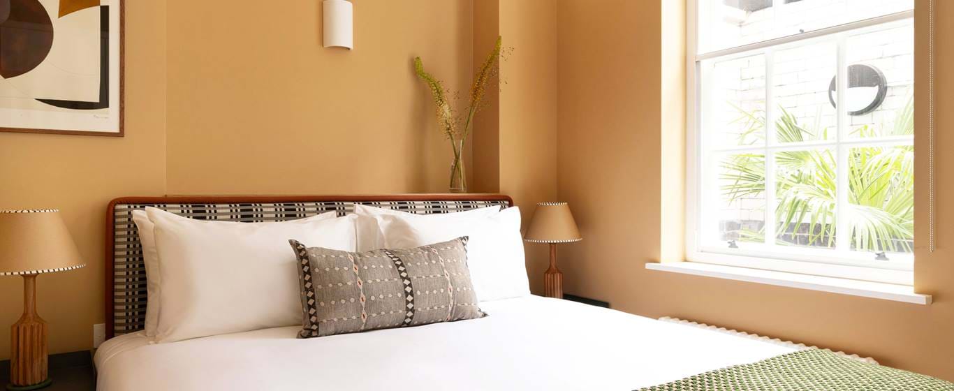 Apartment One on the lower ground floor features a spacious one-bedroom layout with high ceilings, ample natural light, herringbone wood floors, and an original fireplace. Interiors at 65 Harley St, designed with Waldo Works, blend various aesthetics and periods for a sophisticated and relaxed ambiance, combining antique Persian rugs with modern elements like stainless steel and glass.