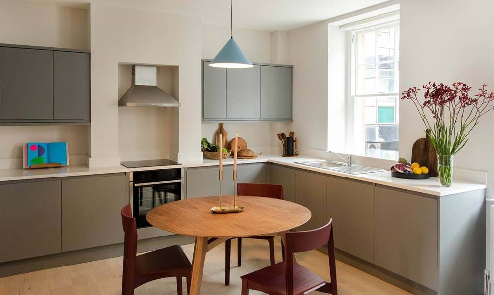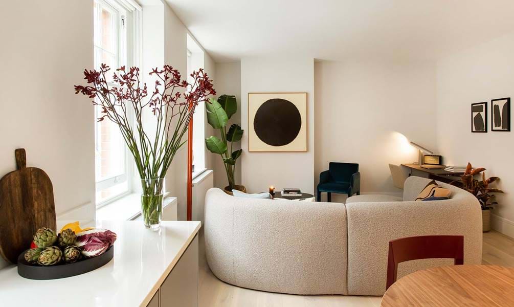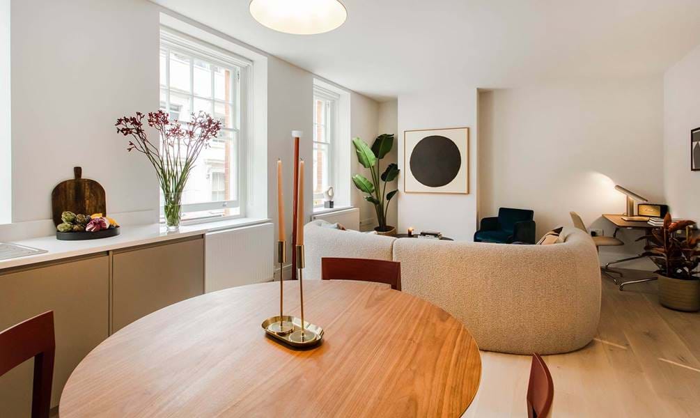 This light filled second floor 1 bed, 1 bath apartment has an open plan kitchen and living space. The bedroom boasts a super king bed and the spacious bathroom has a bathtub with a rain shower. Note that there is no lift at Marylebone Lane.