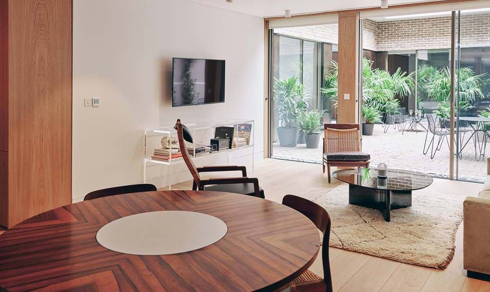 Located on the lower ground floor, Apartment One is the largest apartment at Weymouth Mews and is centred around a spacious, planted courtyard. Designed to maximise natural light, the living area and each of the 3 bedrooms are fitted with floor to ceiling doors that open out onto the courtyard. Note there is no lift at Weymouth Mews.