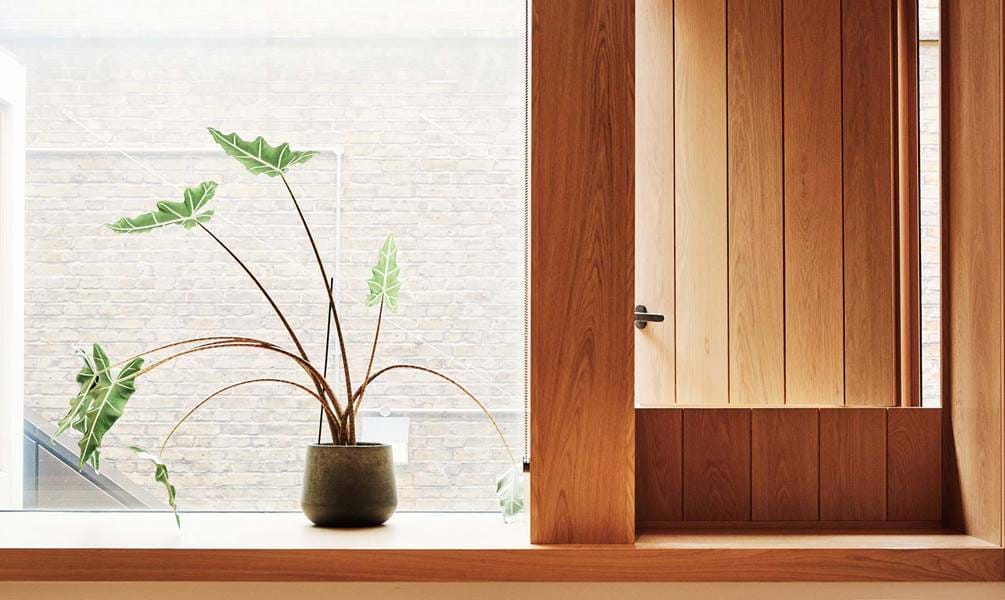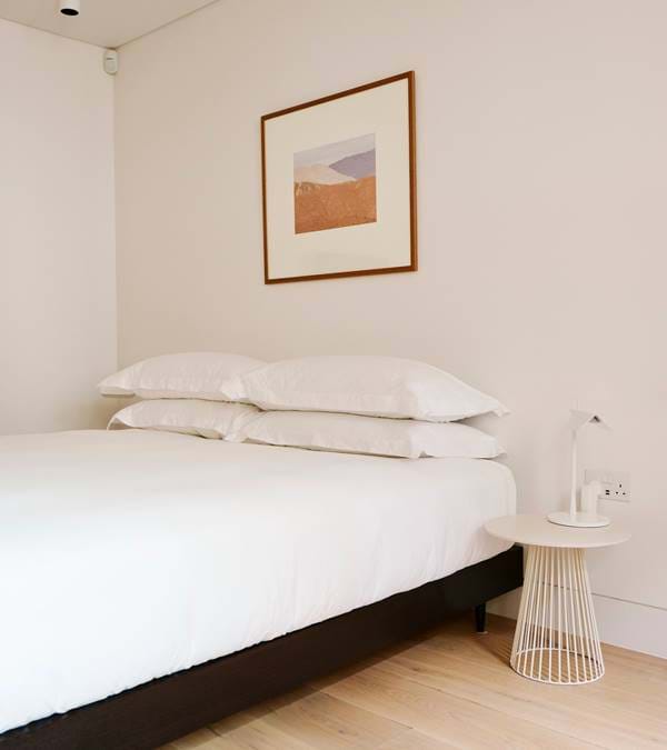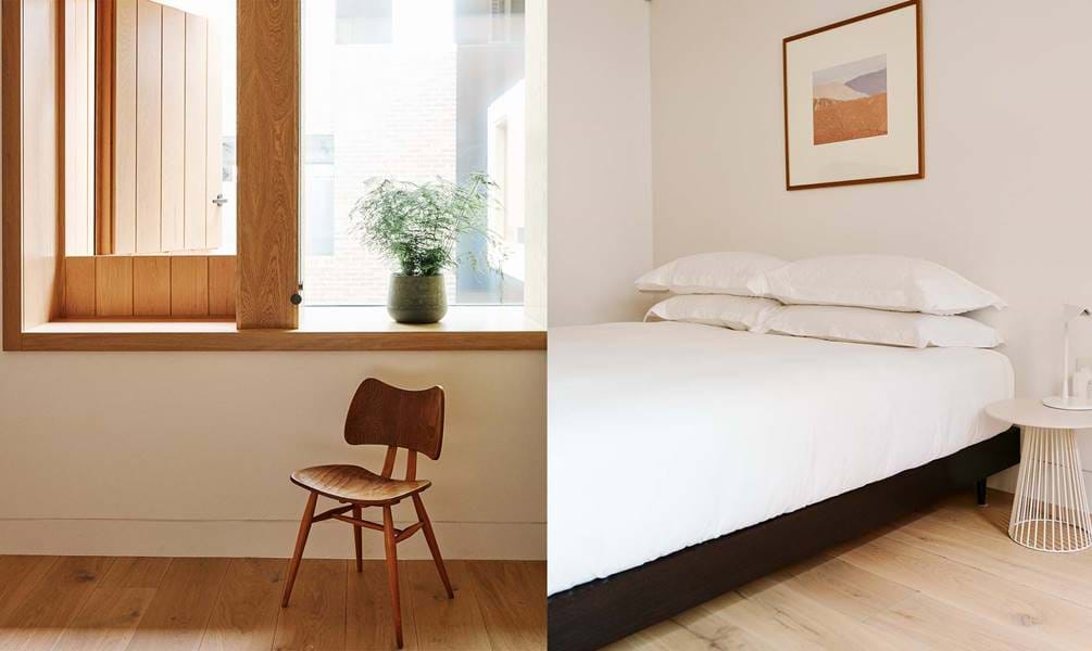 Located on the ground floor, Apartment 2 opens into an open plan kitchen, living area with views out over a planted courtyard. With wooden floors throughout and an exposed brick wall running the length of the area, the space has a modern industrial feel.